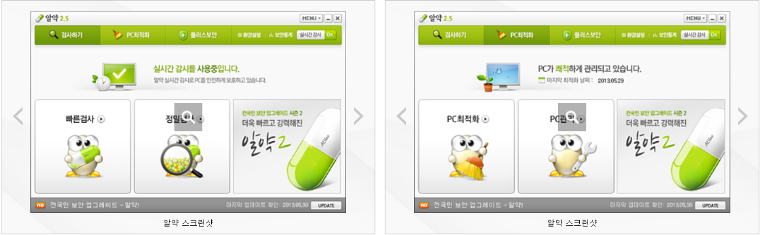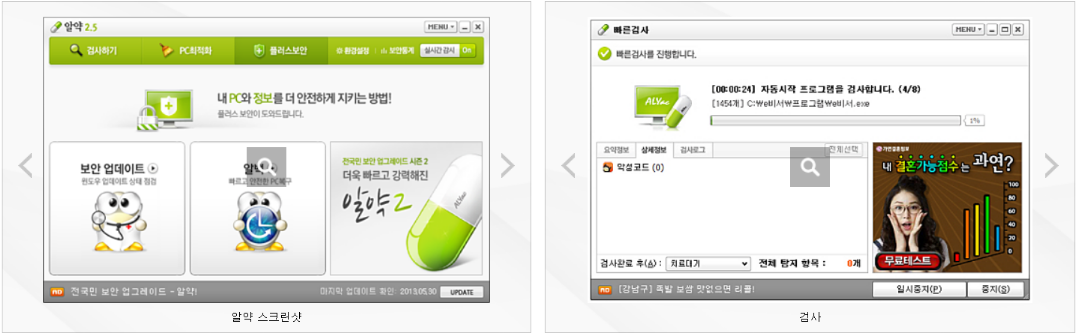 알약은 듀얼 엔진을 기반으로 바이러스는 물론 스파이웨어나 애드웨어, 루트킷, 트로이목마 등의 악성코드 파일을 한번의 클릭으로 간단하게 검사하고 치료합니다.