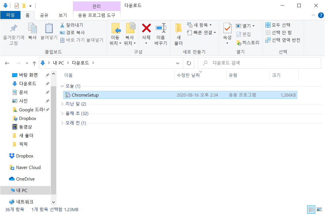 다운로드 폴더로 이동하면 구글 크롬(Chrome) 브라우저 설치 프로그램이 보입니다. 설치 파일을 <실행> 합니다.
