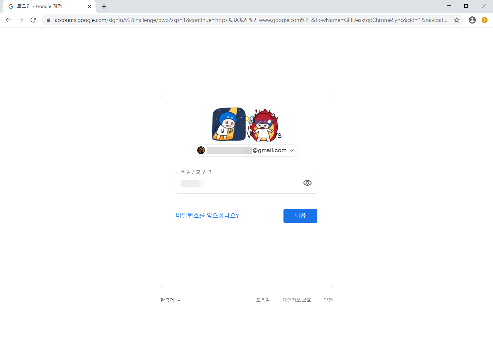비밀번호를 입력하고 <다음>을 누릅니다.