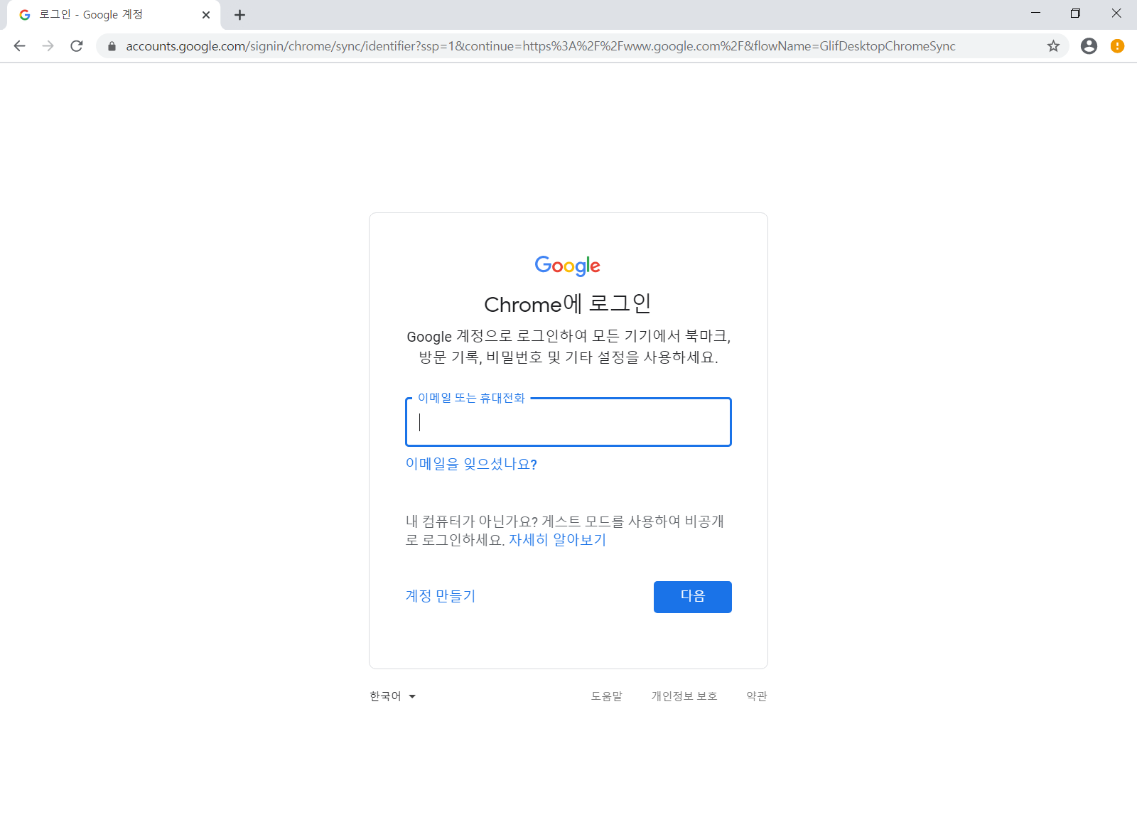 구글 아이디를 입력하고 <다음>을 누릅니다.