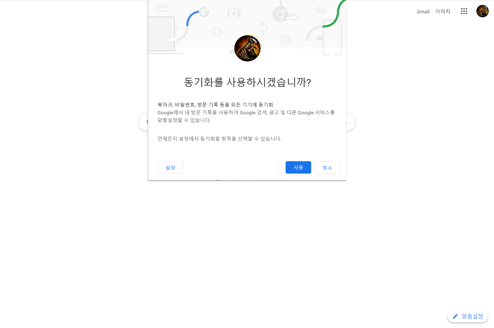<사용>을 누릅니다. 동기화를 사용하면 기존에 사용하던 설정이 그대로 불러와져서 동일한 환경으로 사용할 수 있습니다.