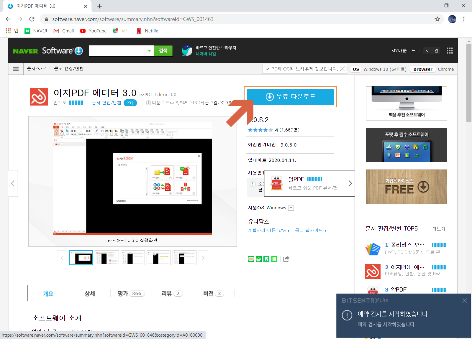 이지PDF 에디터(ezPDF Editor) 다운로드 페이지로 이동합니다. <무료 다운로드>를 누릅니다.