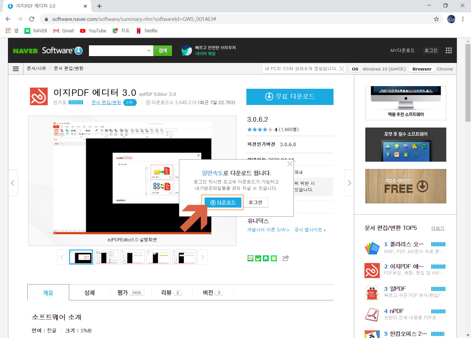 <다운로드>를 누릅니다. 네이버에 로그인을 하면 다운로드 속도가 빨라지지만 크리 큰 영향은 없습니다.