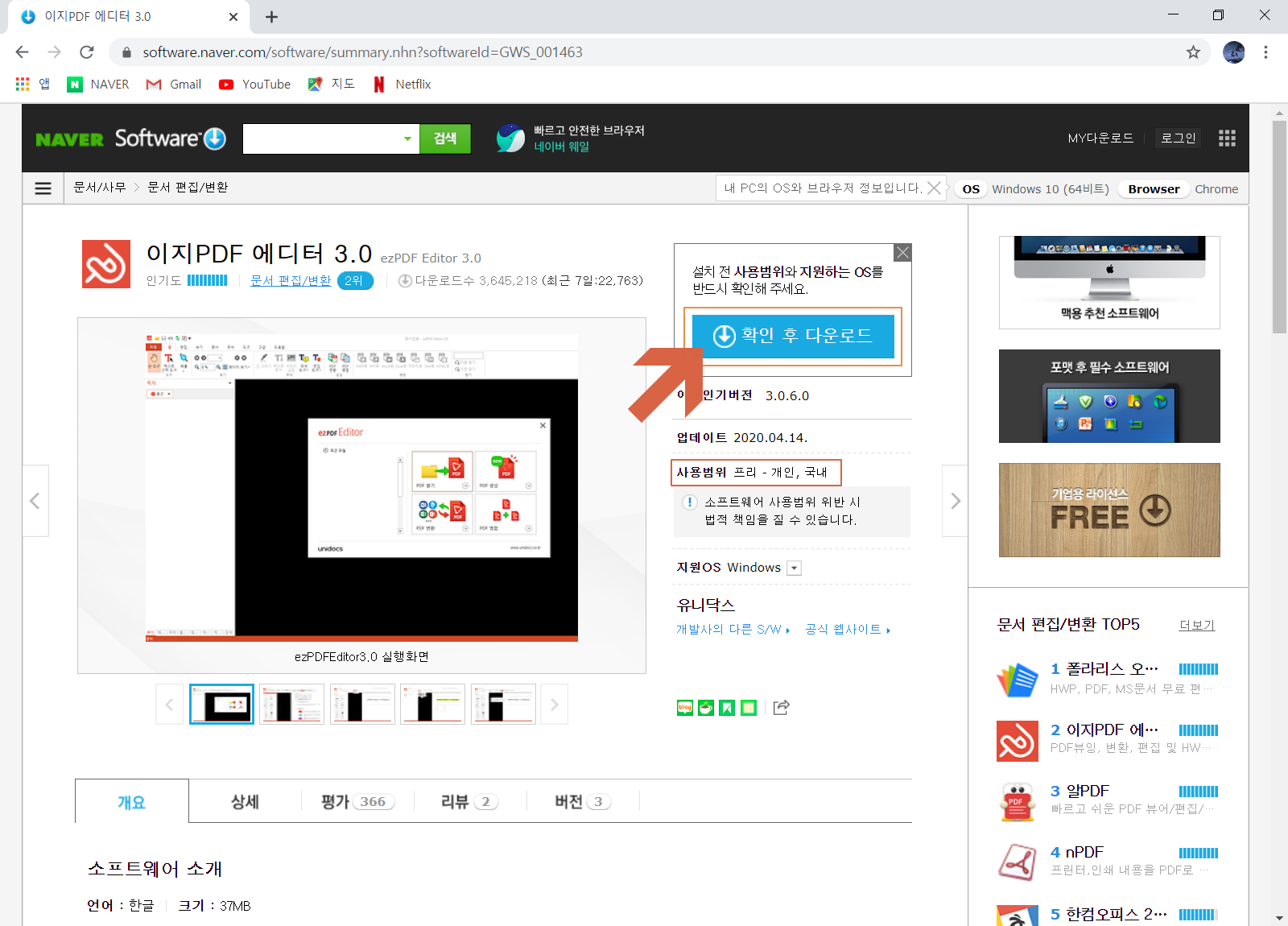 <확인 후 다운로드>를 누릅니다. 사용범위는 프리웨어이며, 개인사용자에 한하여 무료로 사용이 가능합니다.