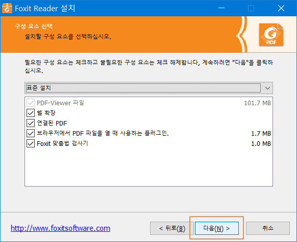 <다음>을 클릭합니다. 만약 다른 PDF 뷰어를 사용하고있다면 <Foxit Reder를 기본 PDF 뷰어로 설정>을 체크 해제 합니다.