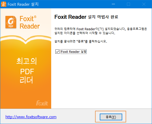 <종료>를 클릭 합니다. 이제 Foxit Reader이 설치가 완료되었습니다.