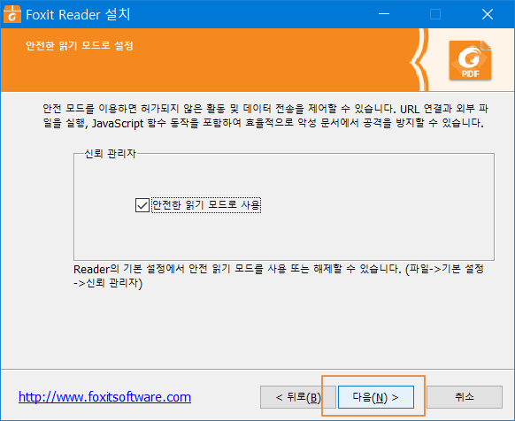 <다음>을 클릭합니다. 만약 다른 PDF 뷰어를 사용하고있다면 <Foxit Reder를 기본 PDF 뷰어로 설정>을 체크 해제 합니다.