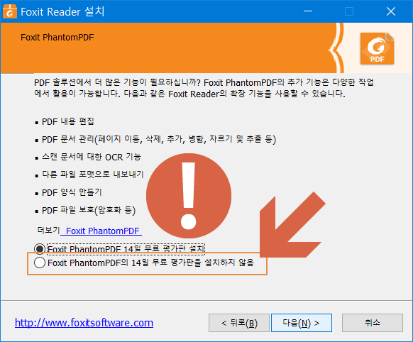 기본 설정으로 14일 무료 평가판 설치에 체크되어 있으므로 <Foxit PhantomPDF의 14일 무료 평가판을 설치하지 않음>을 체크합니다.
