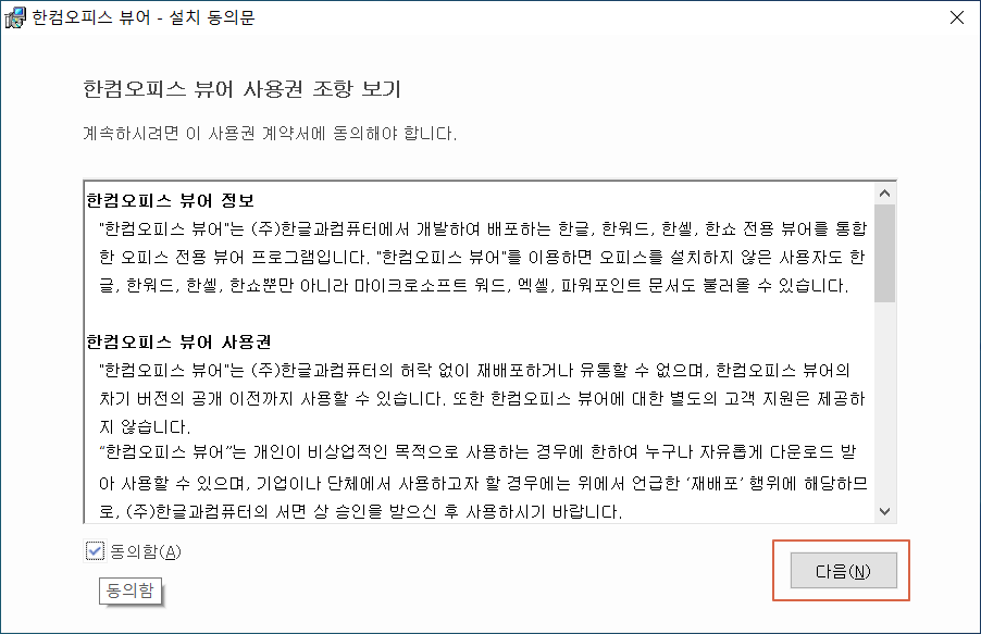한컴오피스 뷰어를 사용할 파일 형식을 선택합니다. <다음>을 클릭합니다.
