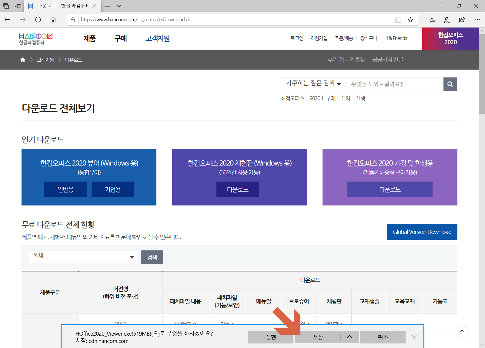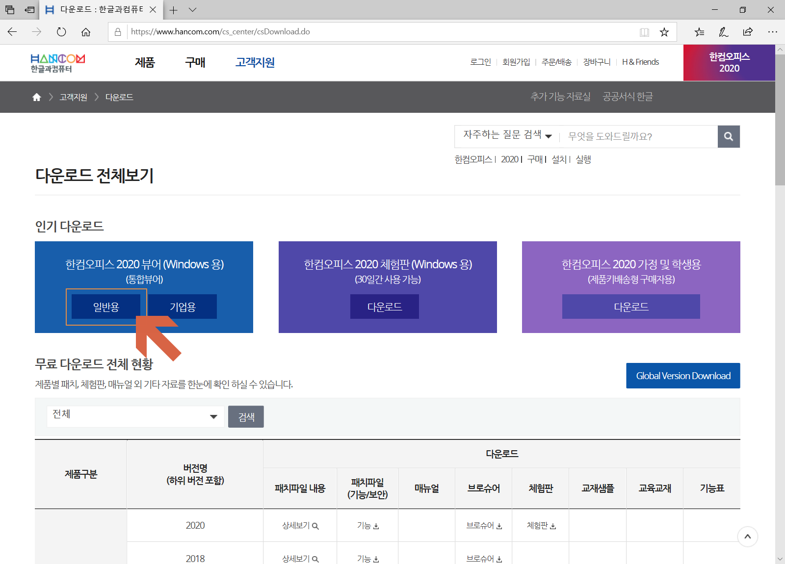 한컴오피스 뷰어 다운로드 사이트로 접속합니다. 화살표의 한컴오피스 2020 뷰어(Windows 용)(통합뷰어)의 <일반용>을 선택합니다.