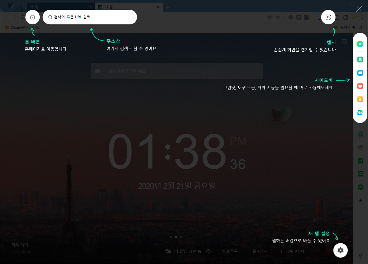 새 탭 설정 : 웨일 테마나 위젯 등을 통해 웨일 꾸미기를 할 수 있습니다.