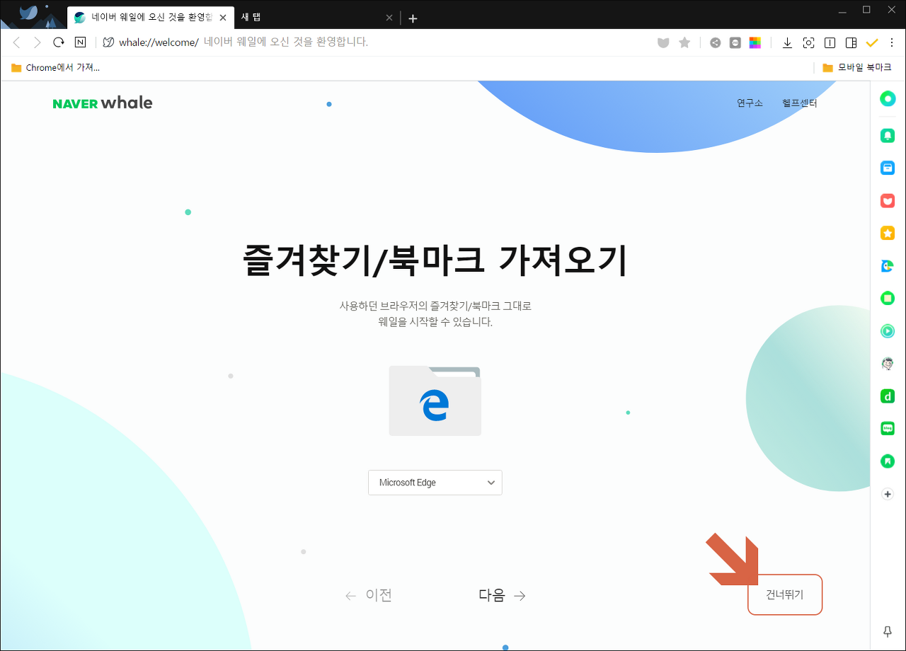 즐겨찾기/북마크 가져오기를 설정합니다. 다른 기존 사용하던 브라우저에서 가져올 수도 있으며, 나중에 설정해도 되므로 일단 <건너뛰기>를 선택합니다.