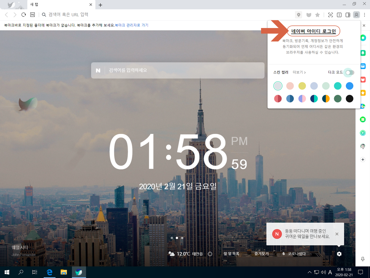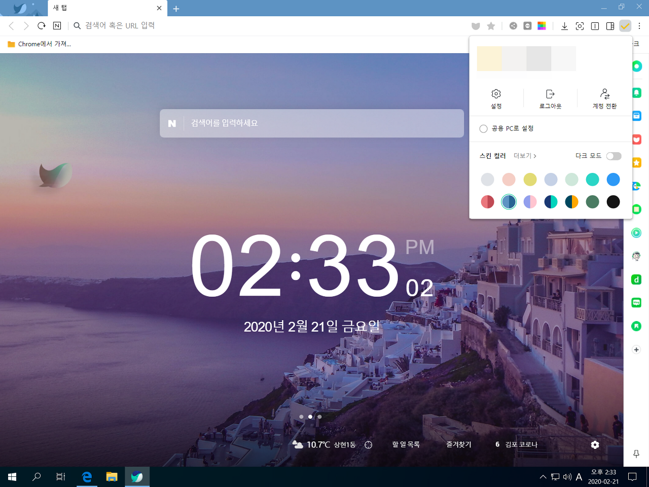 웨일 브라우저 스킨 컬러를 취향에 맞게 선택한 후 <완료>를 클릭합니다.