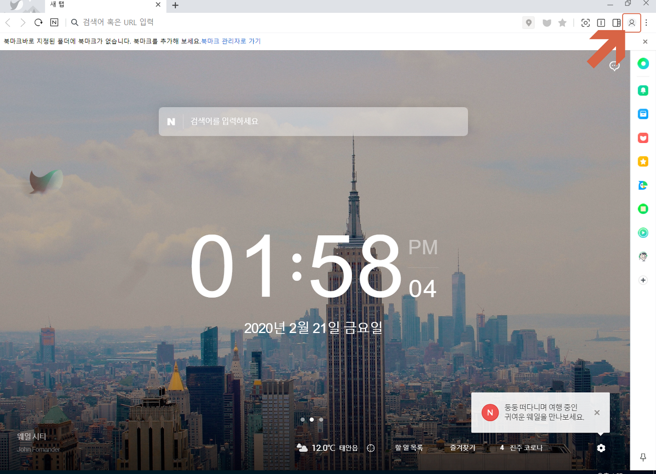 네이버 웨일 브라우저 초기화면 입니다. 이미 로그인을 하였기때문에 기존에 사용하던 설정이나 북마크, 사이드바 등의 기능이 활성화가 되어있는 상태입니다.