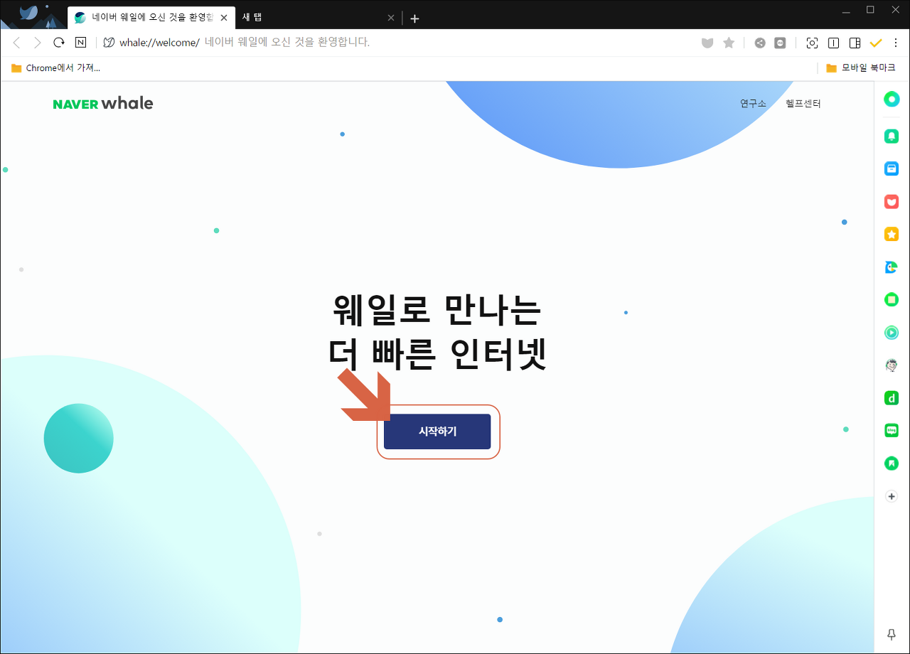 설치가 완료되면 바로 웨일 브라우저가 실행됩니다. <시작하기>를 클릭합니다.