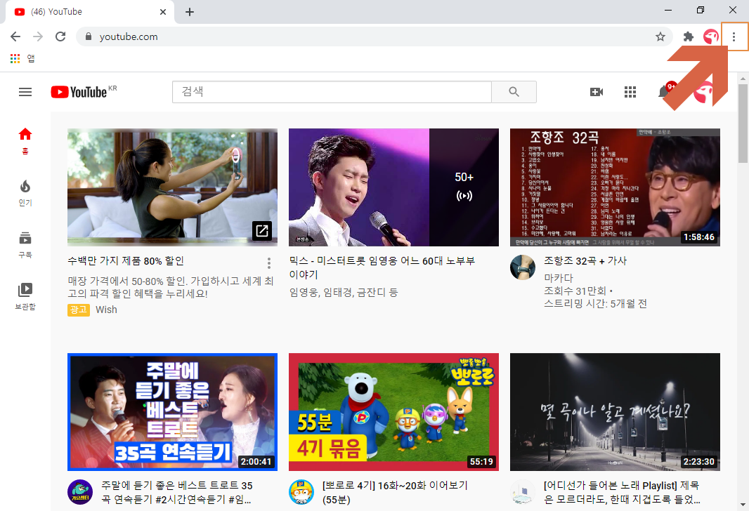 유튜브 홈페이지로 이동하여 구글 크롬 브라우저의 우측 상단 <3개의 점>을 누르시면 메뉴가 나타납니다.
