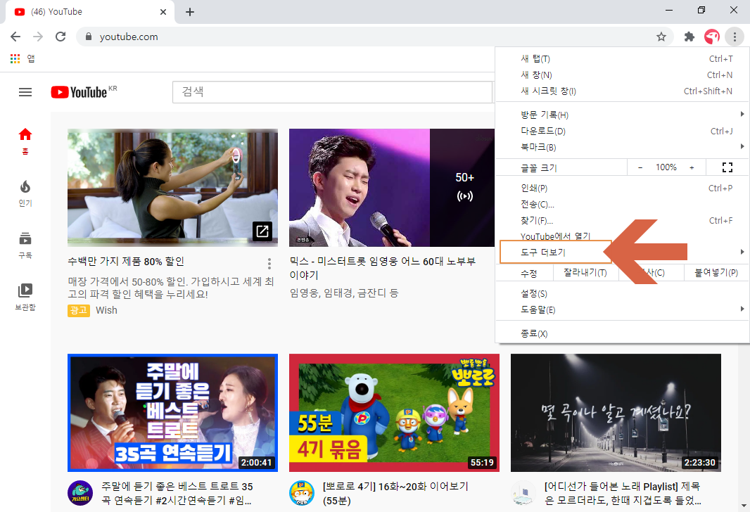 유튜브 홈페이지로 이동하여 구글 크롬 브라우저의 우측 상단 <3개의 점>을 누르시면 메뉴가 나타납니다.