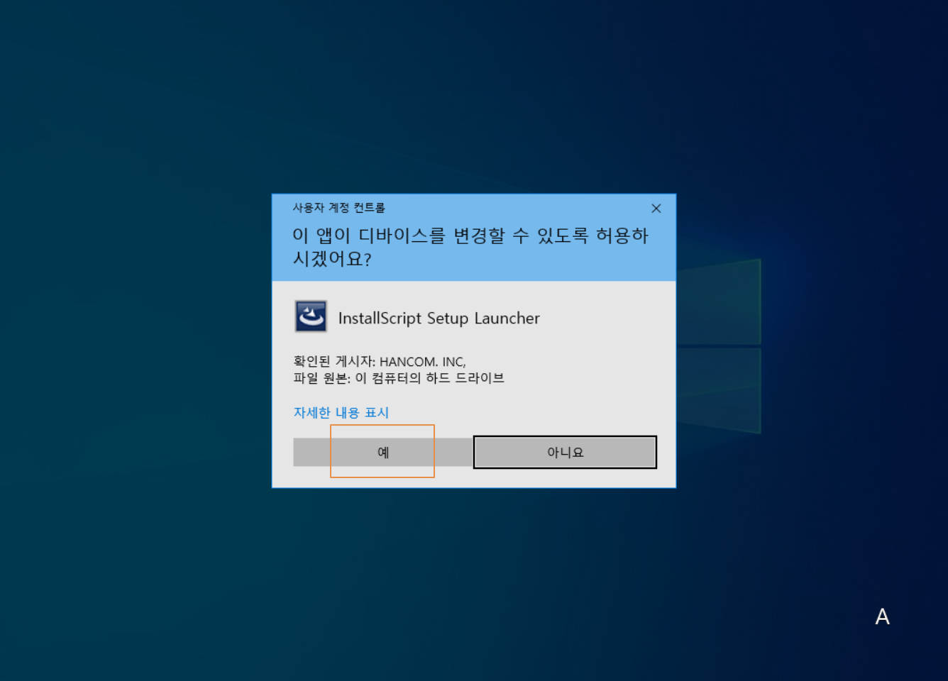 사용자 계정 컨트롤이 실행되면 <예>를 누릅니다.