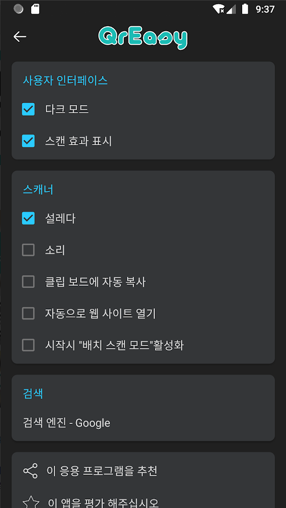 광고가 없으므로 반응속도도 빠르고 이에 따른 렉이 발생하지않아 가볍게 사용이 가능합니다. 현재 구글 플레이(Google Play) 스토어에서 찾을 수있는 가장 가벼운 QR 코드 리더 및 바코드 스캐너 앱이라는 평가가 있습니다.