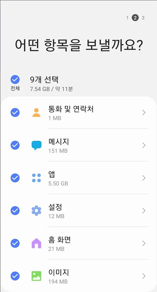 어떤 항목을 보낼지 사진만 보낼것인지 혹은 전체 내용을 보낼것인지 선택하면 신규 휴대폰으로 복사가 진행되고 단지 기다려 주시면 됩니다.