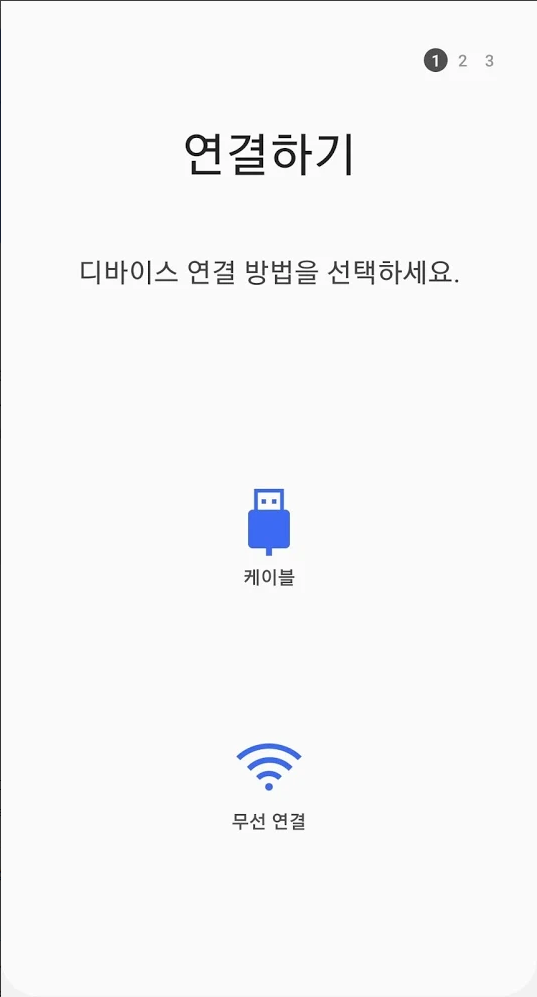 새 휴대전화로 변경시 이전과 신규 휴대폰에 데이터 보내기와 받기를 선택하고 유선 케이블 또는 무선연결로 연결 방법을 선택할 수 있습니다.