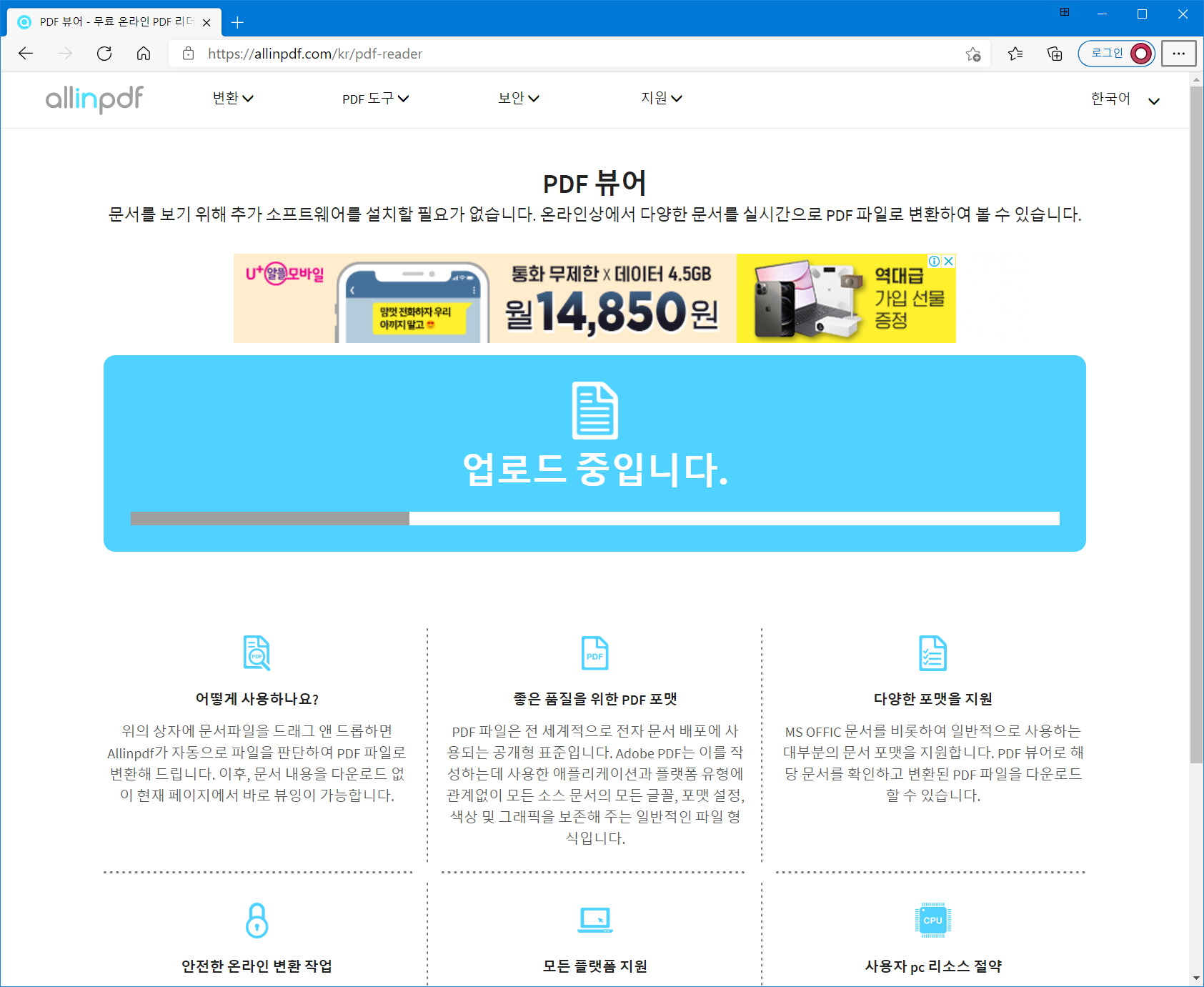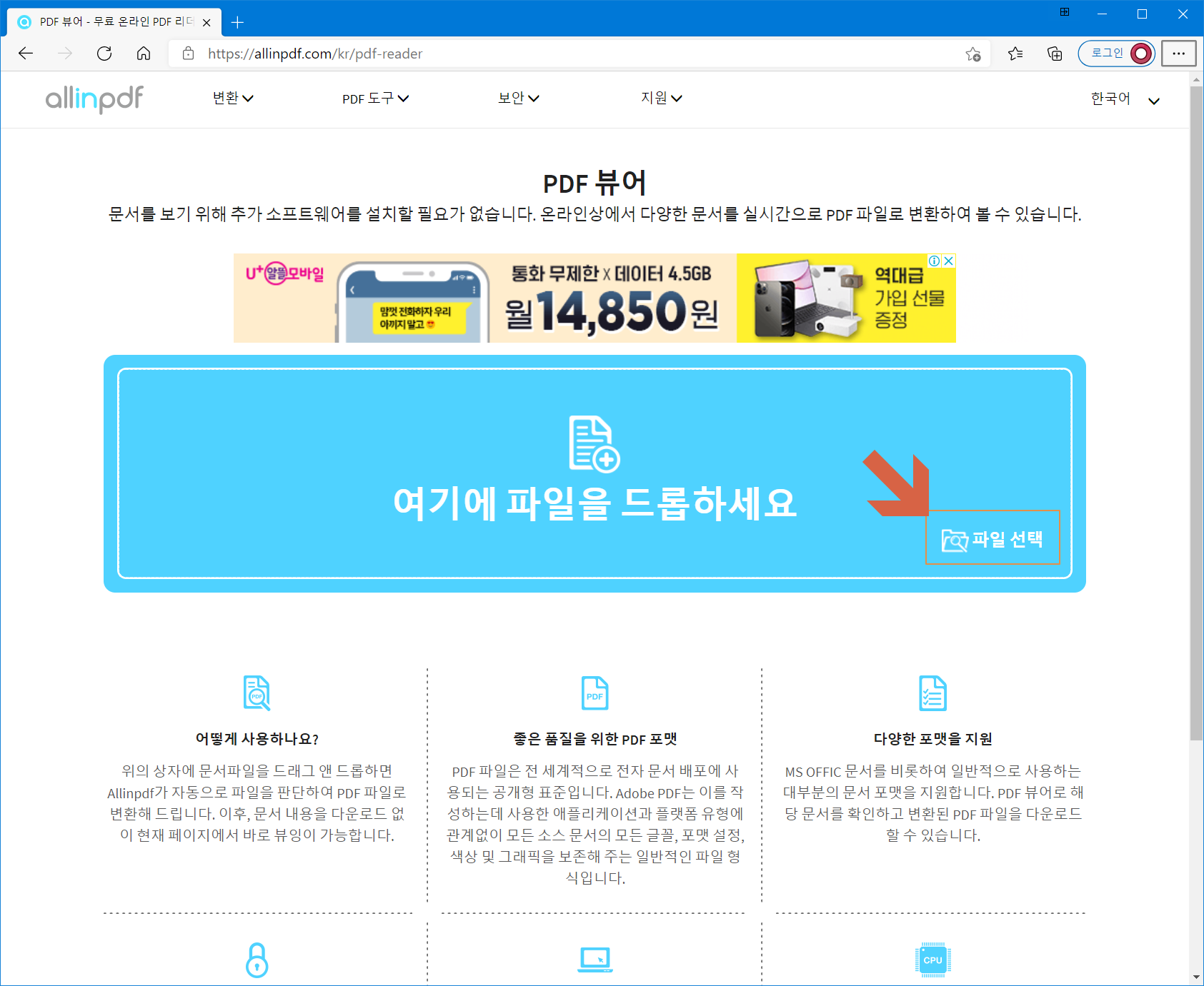 또 중요한 부분은 모든 플랫폼 지원한다는 것이며, 올인피디에프(Allinpdf)는 웹 브라우저를 통해 서비스되는 웹 애플리케이션이기 때문에 익스플로러, 크롬, 사파리, 파이어 폭스, 오페라를 지원합니다.