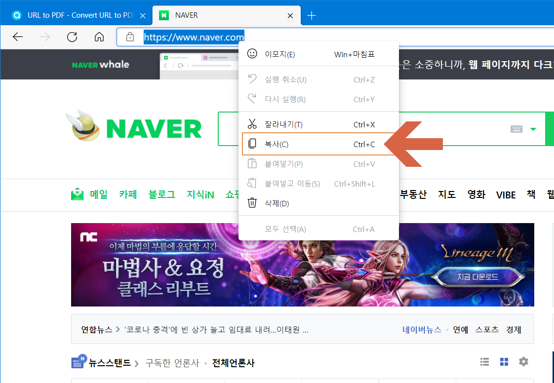 네이버 인터넷 주소창에 마우스 오른쪽 버튼을 누르고 <복사>를 선택합니다.