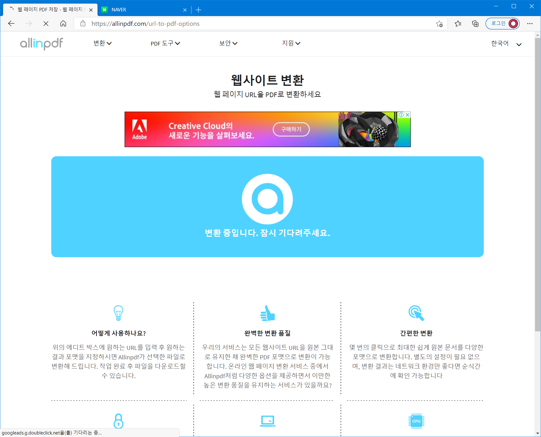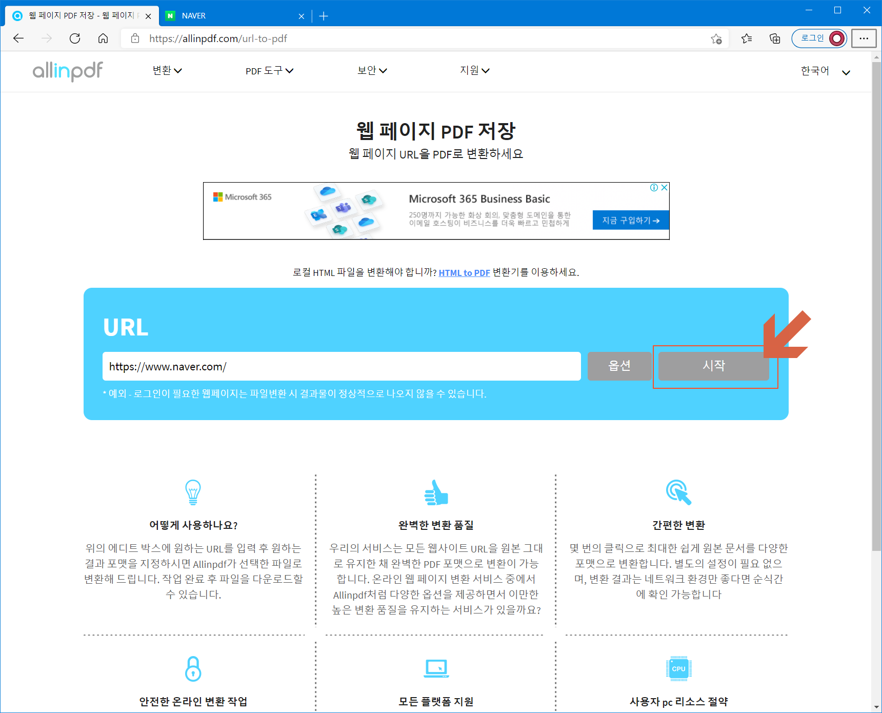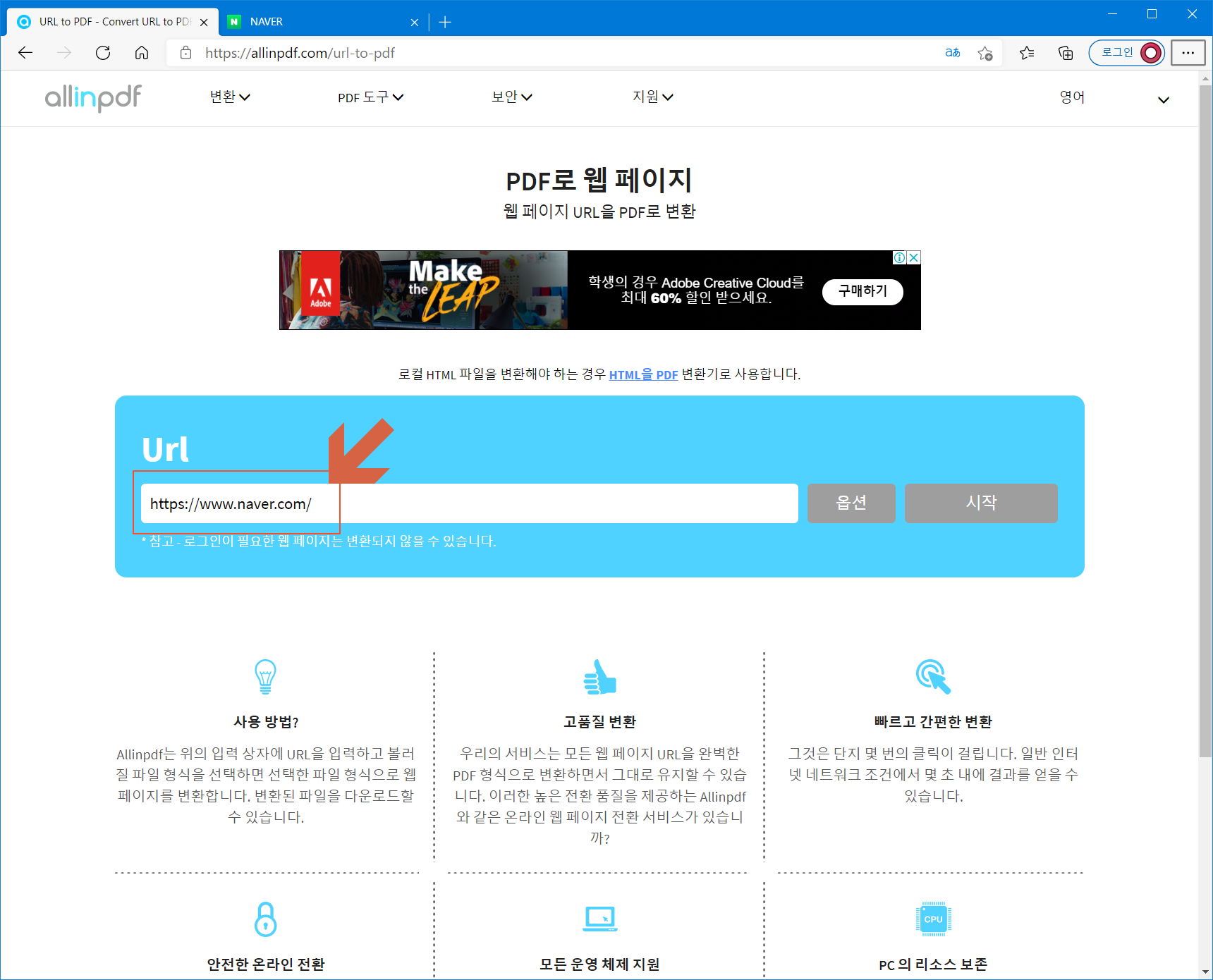 웹 페이지 URL을 PDF로 변환하는 페이지로 접속합니다.