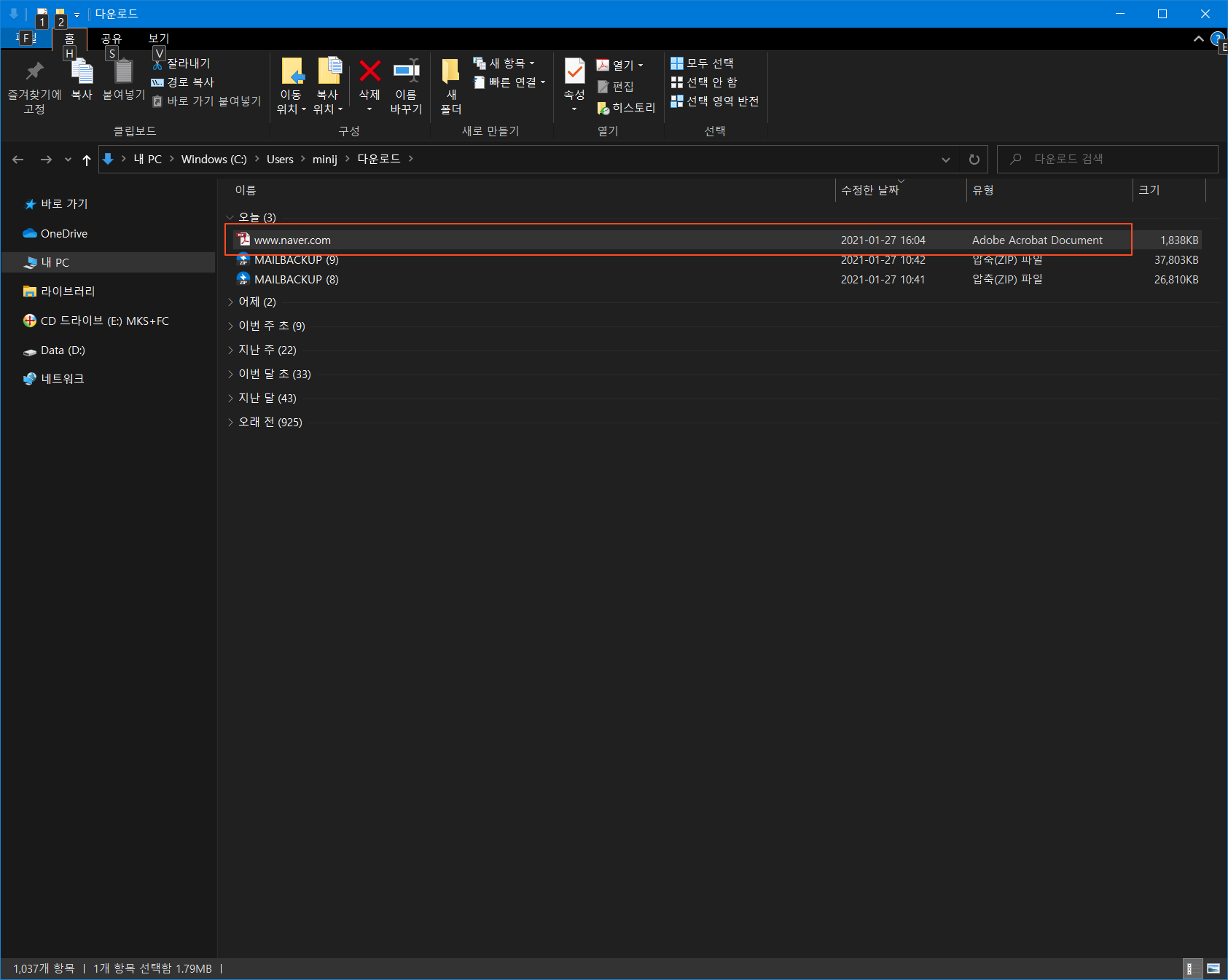 다운로드 폴더로 이동하면 www.naver.com.pdf 파일을 확인할 수 있습니다.