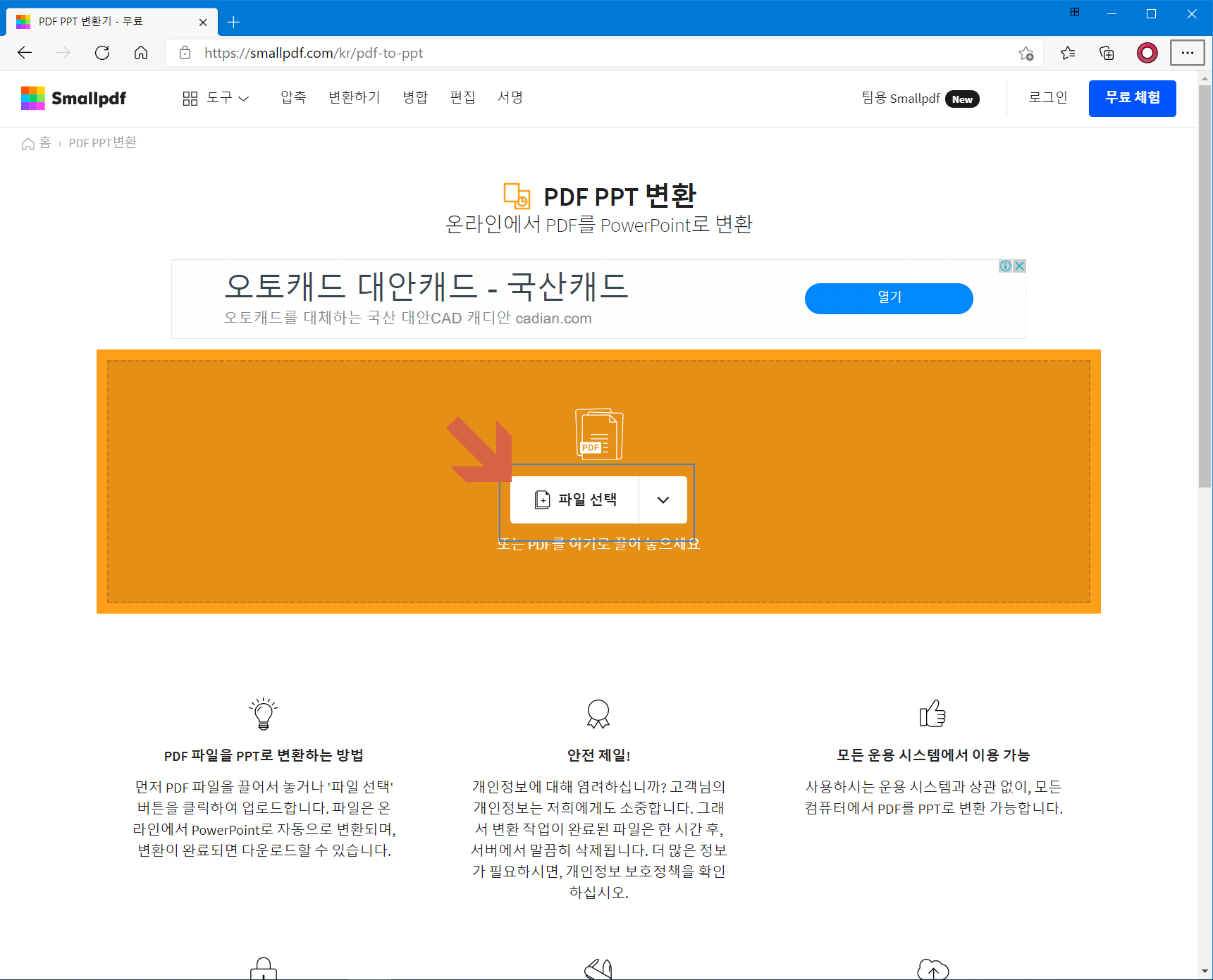 PDF PPT 변환을 위해서는 온라인 웹 어플 페이지로 접속합니다. <파일 선택>을 클릭합니다.