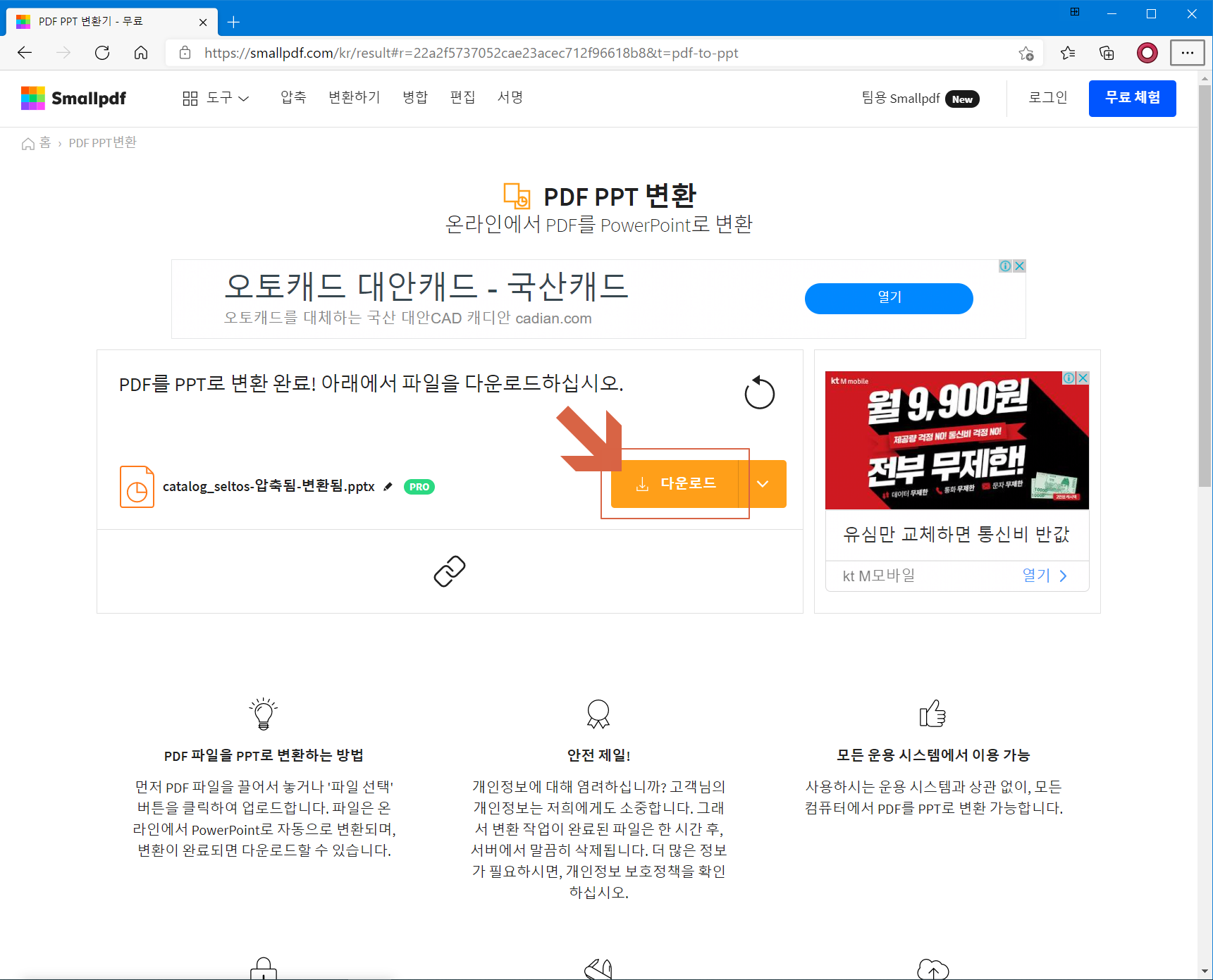 순식간에 작업이 완료되었습니다. PDF 파일이 PPT 파일로 변환되었으며, <다운로드>를 선택합니다.