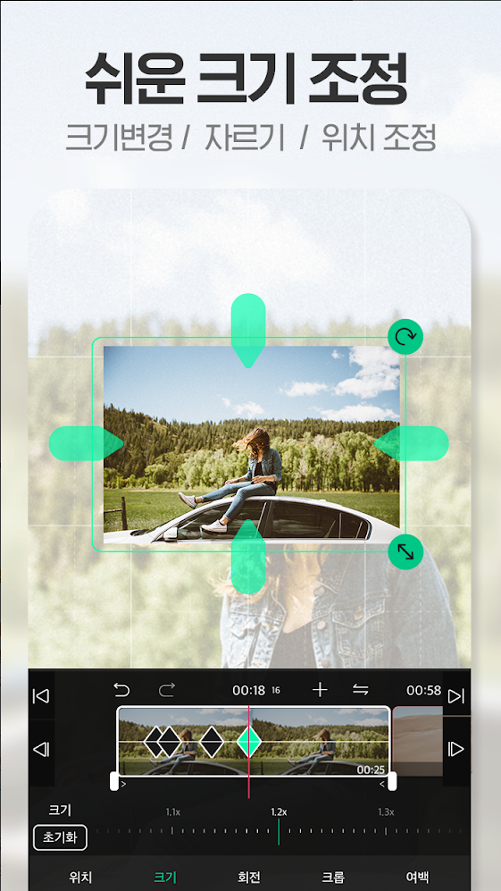 + 간단히 두 손가락으로 스크린 위에서 영상을 확대하거나 축소할 수도 있고 영상의 배경색상을 원하는대로 변경하거나 애니메이션을 추가할 수도 있습니다. 켄번 효과로 정적인 영상에 몰입감을 줄 수 있습니다.