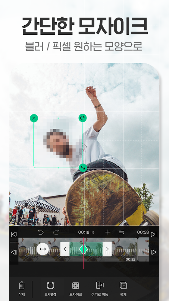 또, 블러 혹은 픽셀로 모자이크 처리한 후 부분 설정을 하여 움직이는 대상을 모자이크로 처리 할 수 있고, 배속, 리버스, 자르기, 영상 순서 변경, 다른 이미지나 영상 추가하기 등 대부분의 컷편집을 모바일 앱 VLLO로 간단히 할 수 있습니다.