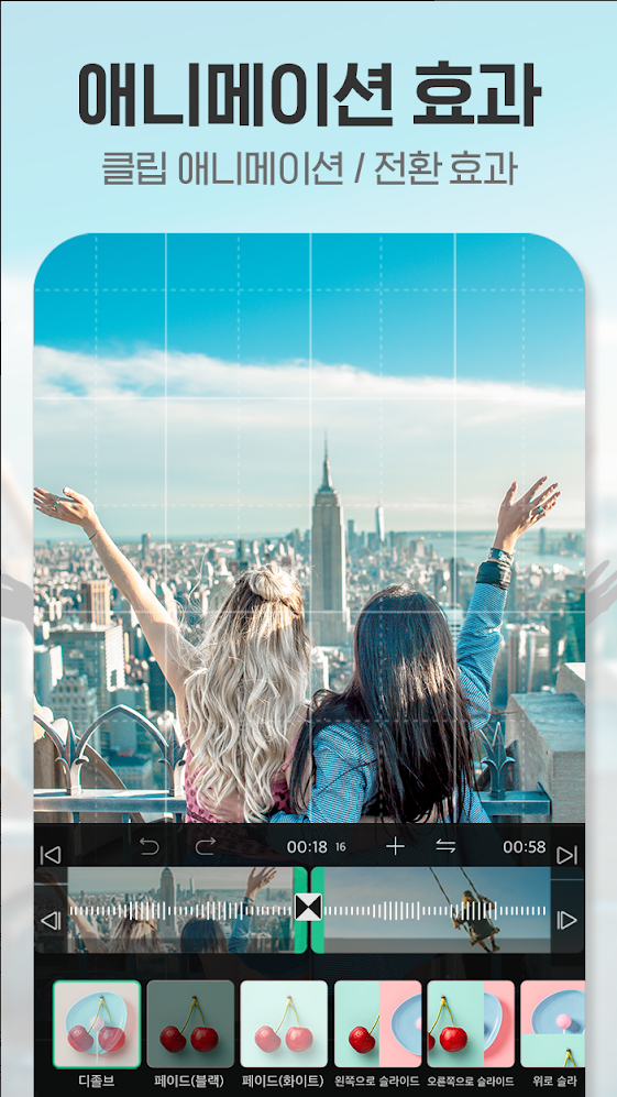 + 디졸브, 밀어내기, 페이드 등 자연스러운 트랜지션과 팝아트 색감의 화려한 그래픽 트랜지션으로 영상의 완성도를 높혀보세요.